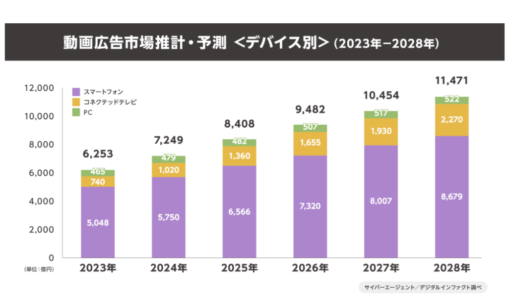調査結果から分かる通り、動画広告市場規模は2023年の6,253億円から、2028年には1兆1,471億円に達すると予測されています。