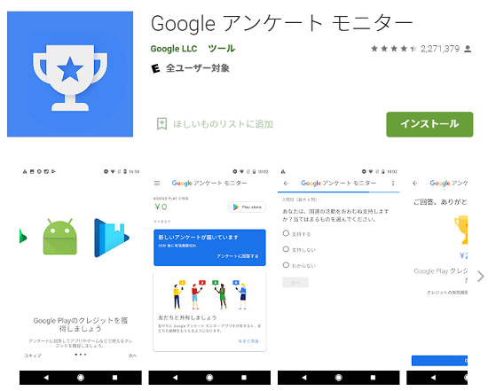 Googleが公式に運営しているアンケートアプリです。不定期に配信される簡単なアンケートに回答することで、Google Playのクレジットや現金として報酬を受け取れます。