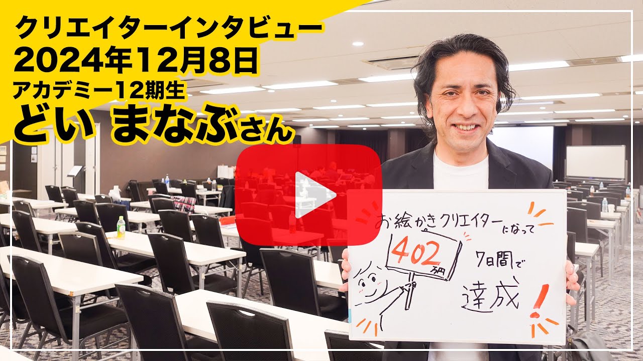 グラフィックデザイナーとして入った会社が倒産。その後は別業界へ転職し長年勤めたが、離職することになり「自分の本当にやりたい事」を見つめ直していたタイミングでアカデミーに出会う。「今回は自分のやりたいことを後回ししない!」と入学を決意。1年半の間にムービーやロゴ制作の依頼で145万円超えの売上を達成。